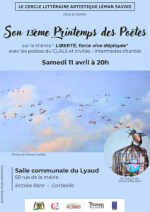 ← Mars 2026 Mai 2026 → Avril 2026 Annulé Mois de l’Autisme – Programme des 28/30 mars et 2 avril 2026 28 mars 2026 au 2 avril 2026 Annulé Visite guidée du Jardin Alchimique mercredi 1 avril 2026 de 14:00 à 16:00 Annulé CHASSE AUX ŒUFS samedi 4 avril 2026 de 09:00 à 12:00 Annulé Réunion mensuelle vendredi 10 avril 2026 de 18:00 à 22:00 Annulé Rencontre LPO Chablais vendredi 10 avril 2026 de 19:45 à 22:15 Annulé Printemps des Poètes samedi 11 avril 2026 de 20:00 à 22:00 Annulé Atelier « Manger les mauvaises herbes » dimanche 12 avril 2026 de 10:00 à 12:00 Annulé 12 AVRIL Rendez-vous au Delta dimanche 12 avril 2026 de 10:00 à 12:00 Annulé Projection de : Bons Baisers de Bruges jeudi 16 avril 2026 de 20:00 à 22:30 Annulé Projection « UN MONDE FRAGILE ET MERVEILLEUX » vendredi 17 avril 2026 de 20:30 à 22:30 Annulé Fête engAGée de LAC CHABLAIS ! samedi 18 avril 2026 de 18:45 à 23:45 Annulé Cueillette Nomade dimanche 19 avril 2026 de 08:30 à 11:30 Annulé Cueillette Nomade mercredi 22 avril 2026 de 14:00 à 17:00 Annulé PARLONS VRAI ! Soirée ciné-débat : L’eau en agriculture mercredi 22 avril 2026 de 19:00 à 23:00 Annulé Projection-débat TOUT VA BIEN jeudi 23 avril 2026 de 20:00 à 22:30 Annulé Projection-débat TOUT VA BIEN jeudi 23 avril 2026 de 20:00 à 22:30 Annulé Rencontre/partage autour de l’allaitement vendredi 24 avril 2026 de 14:00 à 15:30 Annulé Rendez-vous le 25 avril pour l’Assemblée Générale du CPIE samedi 25 avril 2026 de 09:00 à 12:00 Annulé FORUM de SANTÉ samedi 25 avril 2026 de 10:00 à 17:00 Annulé Projection-débat Welcome to Europe mardi 28 avril 2026 de 20:00 à 22:30 Annulé Projection « LE CHANT DES FORETS » mercredi 29 avril 2026 de 19:30 à 21:30