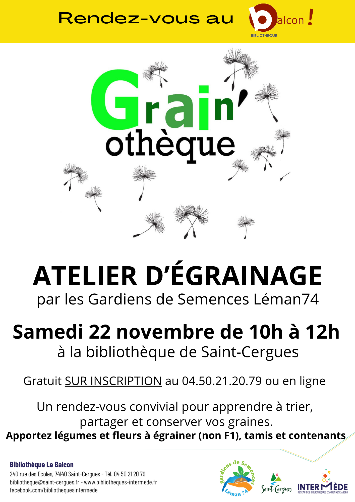 Les Gardiennes de Semences animeront un atelier d’égrenage à Saint-Cergues le samedi 22 novembre 2025 de 10h à 12h à la Bibliothèque de Saint-Cergues en lien avec la grainothèque locale.
