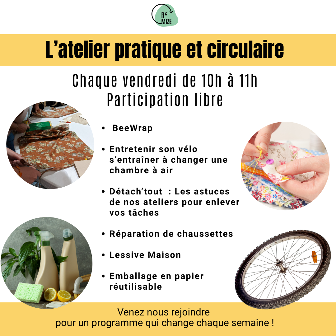 Chaque semaine, la R’mize vous propose un atelier gratuit, sans inscription, d’1h pour découvrir des astuces pratiques et circulaires.