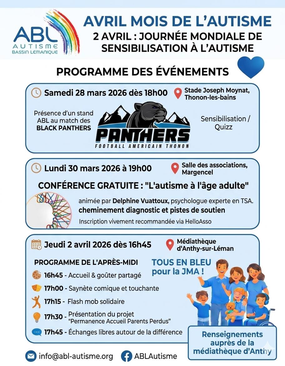 ABL et la Médiathèque d’Anthy vous proposent dans le cadre de la Journée Mondiale de l’Autisme, le jeudi 2 avril de 16h45 -19h, plusieurs évènements :