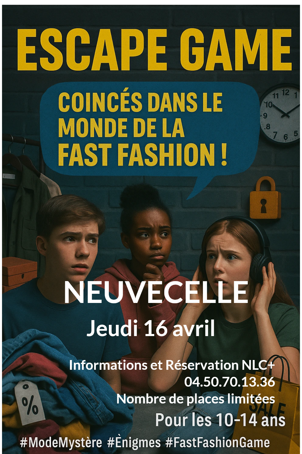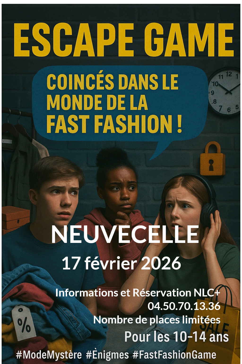 L’escape game plonge les joueurs dans l’univers de la consommation vestimentaire : conditions de production, pollution liée aux fibres synthétiques, gaspillage textile… Autant de réalités souvent méconnues qui se cachent derrière nos vêtements du quotidien.