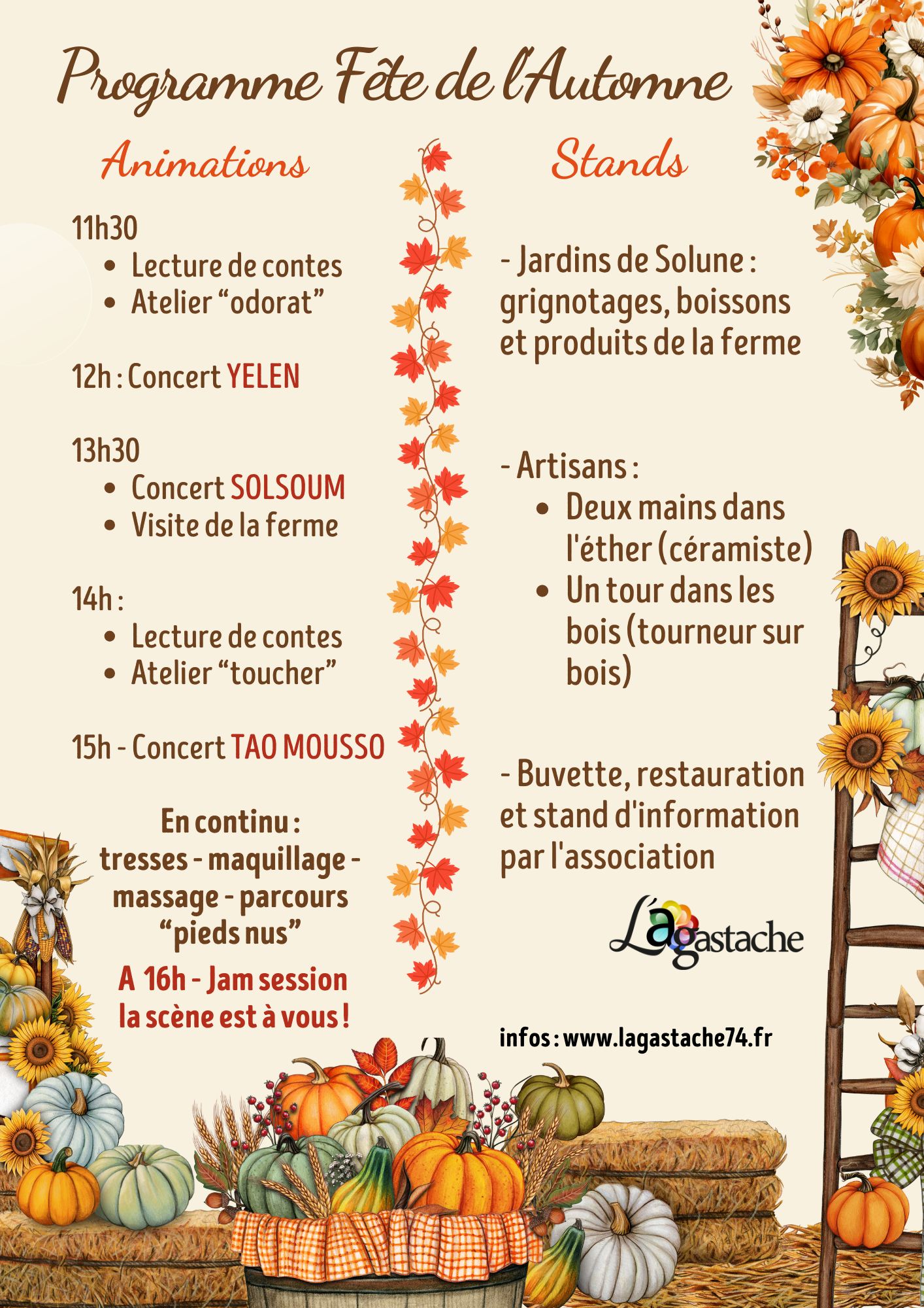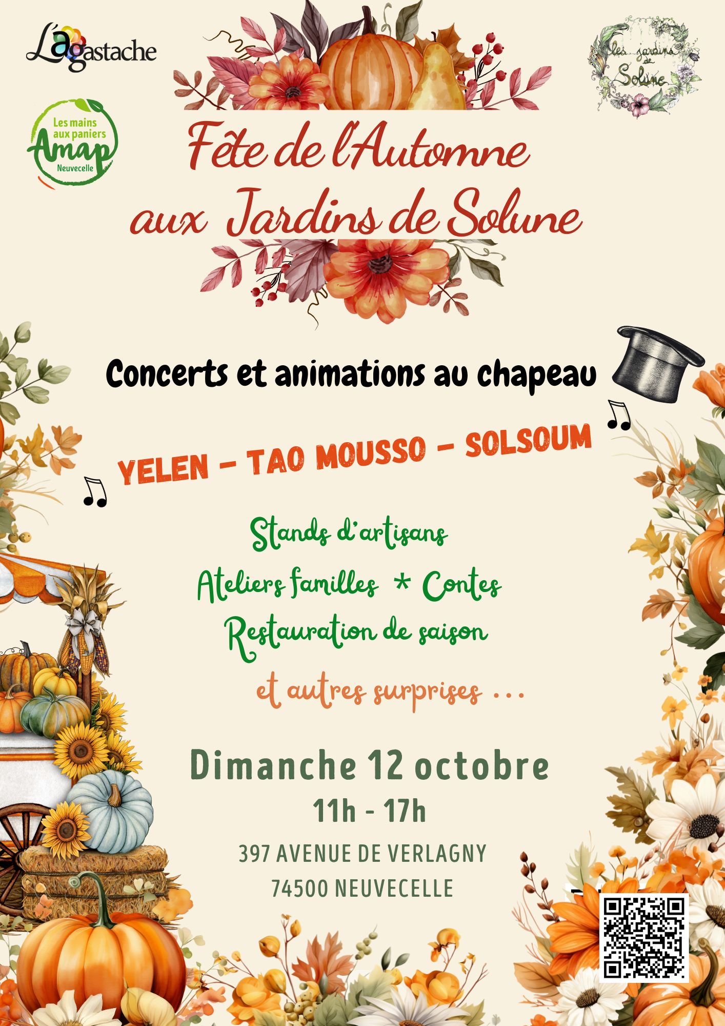 De 11h à 17h dimanche 12 octobre, on se retrouve aux Jardins de Solune à Neuvecelle pour une nouvelle fête de l’automne sympathique. Collations de saison (dont notre fameuse soupe de courge), ateliers famille autour du toucher et de l’odorat, parcours pieds nus, contes, stands d’artisans, massage, maquillage et tresses…Le tout rythmé par 3 concerts d’exception : Yelen, Solsoum et Tao Mousso. Le programme détaillé est ci-dessous en pièce jointe et sur notre site web.
