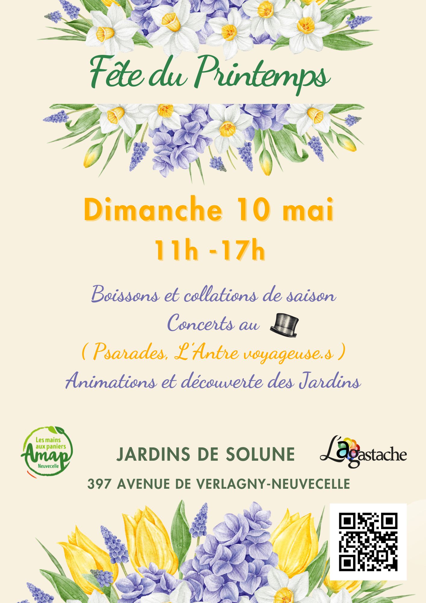 Dimanche 10 mai de 11h à 17h, venez nous rejoindre aux Jardins de Solune pour fêter le printemps. De 11h30 à 13h30 Lire et Faire lire fera découvrir des lectures inspirantes aux plus jeunes. Rose leur proposera un peu plus loin de se maquiller. Stands massage, artisanat local, vente de plants d’agastaches. Buvette avec petite restauration en continu. Et deux fabuleux concerts pour entrer dans la nouvelle saison : Psarades, musique folk des Balkans (oud, voix, accordéon, percussions) à 13h30 et L’Antre voyageuse.s (handpan, flûte traversière, contrebasse, didjeridoo) à 15h. Venez nombreux !