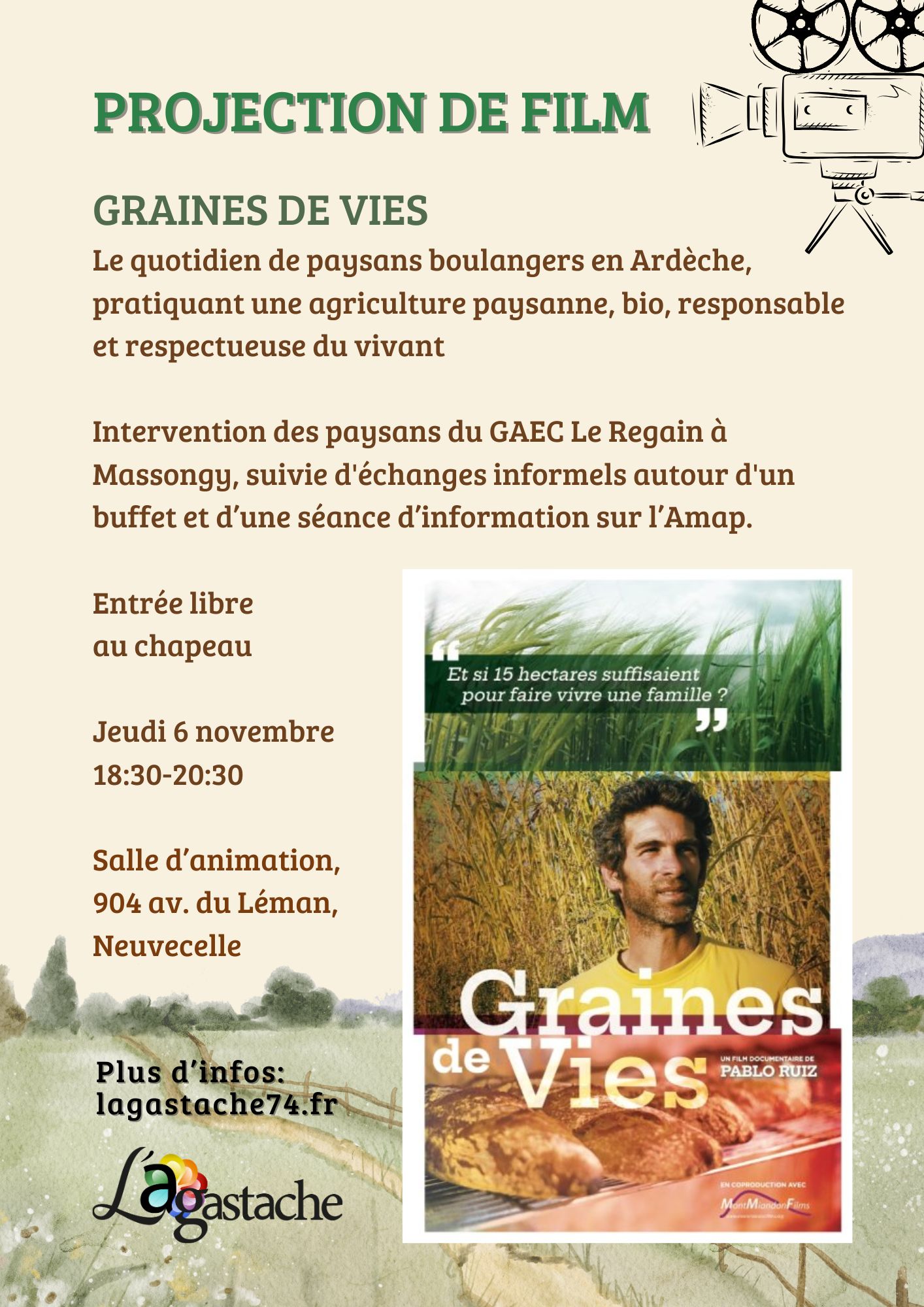 Jeudi 6 novembre, à la salle d’Animation de Neuvecelle, venez partager avec nous le visionnage du film “Graines de vies” qui suit le quotidien de Damien et Céline dans leur activité de paysans boulangers qu’ils pratiquent en Ardèche.