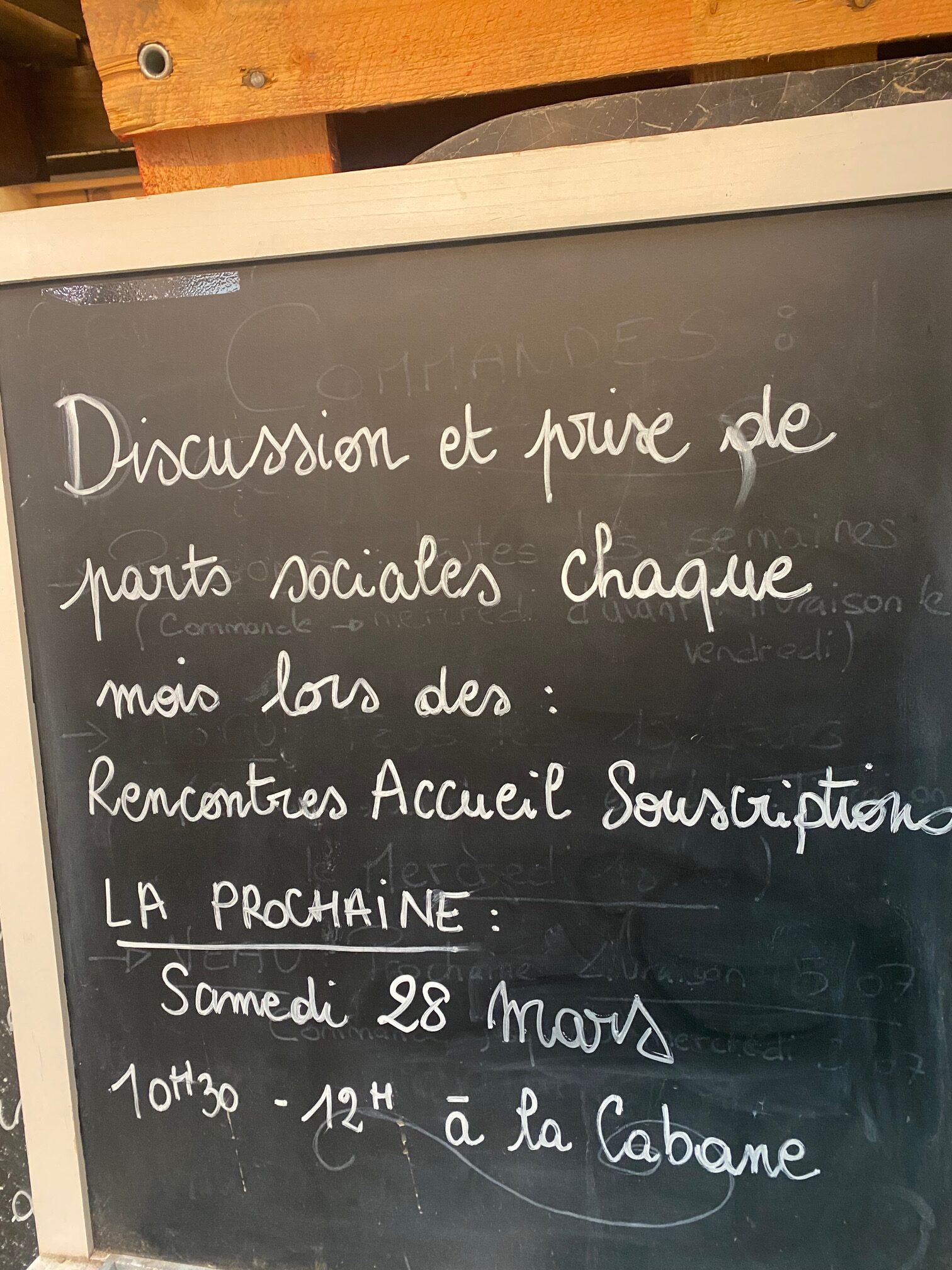 À la cabane, discussion et prise de parts sociales, tous les 4e samedis de chaque mois.