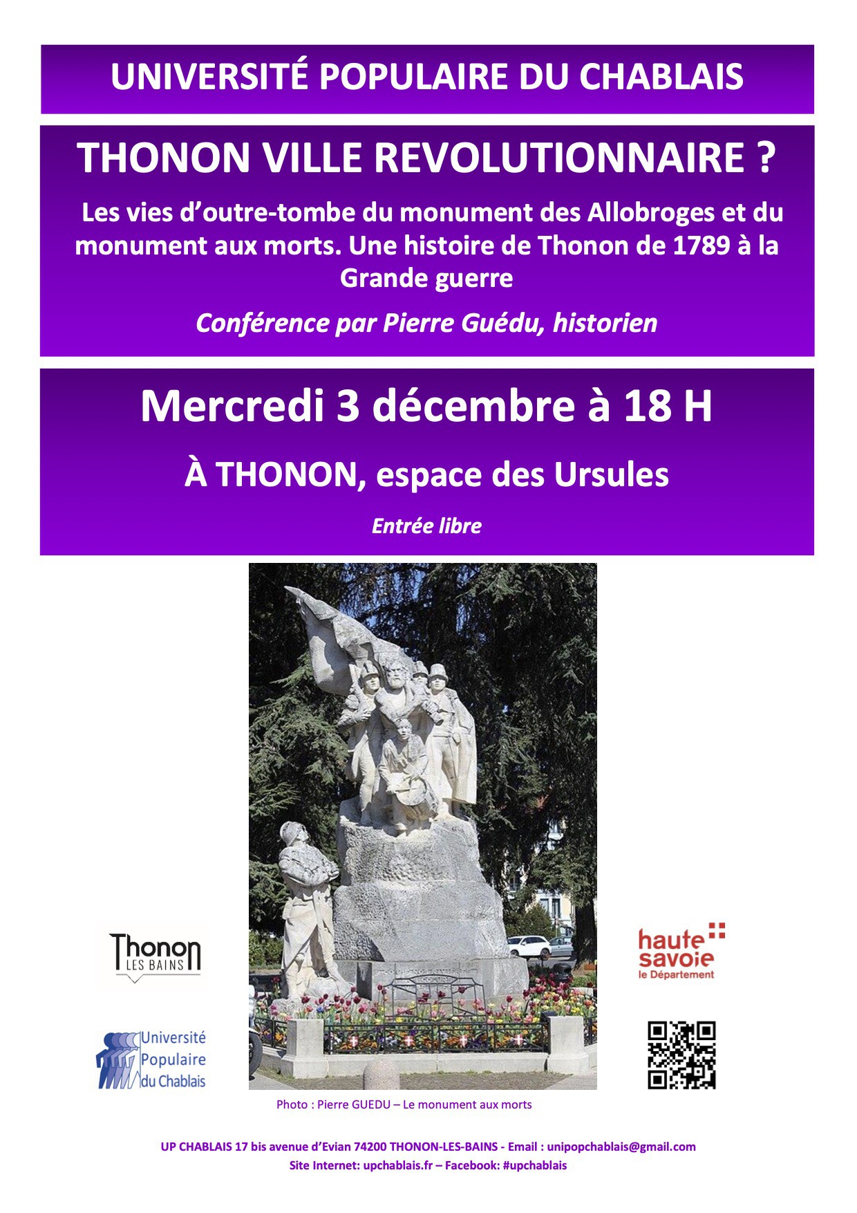 Le monument « aux Allobroges » et « monument aux morts »* de Thonon fait figure d’exception au niveau national : il nous propose de remonter le cours des siècles, de l’Antiquité celte allobroge à la Grande guerre en passant par l’épopée révolutionnaire, nous révélant la richesse et la complexité d’une histoire de Thonon souvent oubliée, guidée par des inscriptions pas toujours compréhensibles aujourd’hui :