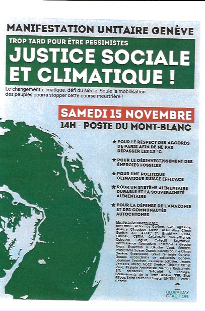 Venez nombreux participer à la manifestation du samedi 15 novembre à Genève. CO-CERNES, l’ACPAT, L’ACLASS sont partenaires .Rendez-vous devant la poste de la rue du Mont-Blanc près de la gare Cornavin. On se rejoint devant le magasin Swiss traditions